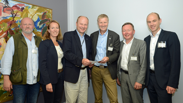 Her overrekker Runar Rugtvedt (i midten til høyre) de fem organisasjonenes felles opprop til statssekretær Lars Andreas Lunde (i midten til v.). Fra venstre mot høyre er: Nils Solberg i Folkeaksjonen ny rovdyrpolitikk; Anne G. Delphin i NORSKOG, Olav Veum i Norges Skogeierforbund og John Deighan Hanssen fra Utmarkskommunenes Sammenslutning. (Foto: Åsmund Lang)