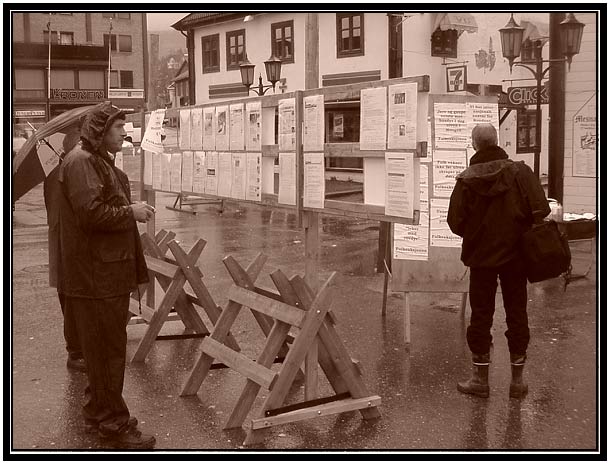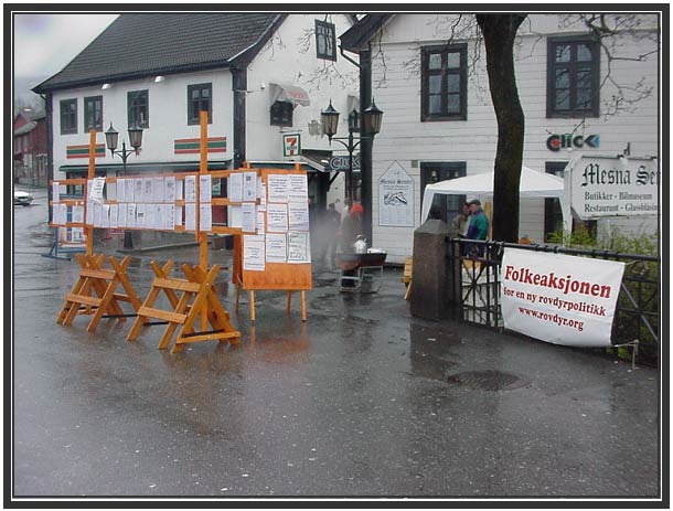 Folkeaksjonens lokallag på Lillehammer hadde stand i "bikkjeværet" på Lilletorget 1.mai. De få lillehamringene som våget seg ut i regn og blåst denne 1. mai, fikk varme seg ved grillen med solbærtoddy og møre lammekoteletter.