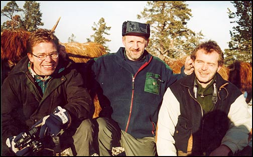 DRA HJEM: Ulveaksjonistene Svein Sørli (t.h.) og Tormod Vaaland Burkey, fikk klar beskjed fra heidølene: - Pell dere hjem. Ulveproblemene våre skal vi rydde opp i selv. Her får de en ørefik, i all vennskaplighet, av gardbruker og politiker Erling Lusæter i Heidal. (Foto: Lars Kristian Steen)