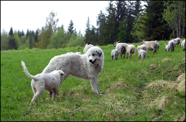 Å prege den på sau har vært vanskelig, - og er det fortsatt. Men sakte, men sikkert vekkes trolig vokterinstinktet etter hvert som hunden får et naturlig forhold til sauene i stedet for å være redd dem. Å ha den sammen med den litt over året gamle Pyreneerhunden vår, er - ikke uventet - svært uheldig. Den ene er valp, den andre unghund, og sammen stimulerer de valpeegenskaper hos begge. Det blir mye leking, som fører til uro i saueflokken. I blant ender det med jaging. Dette er ikke noen oppsiktsvekkende erfaring, men tvert imot ganske vanlig. Noe annet hadde det vært om valpen var vant med sau. Men den er livredd sauene, særlig hvis de er mange. Dersom en voksen sau kommer for nær, har den hatt en tendens til å underkaste seg (altså legge seg på rygg), eller den tar mot til seg og begynner å bjeffe. Begge deler er feil adferd.