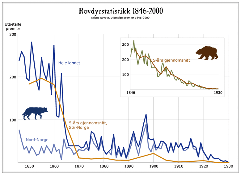 Historien har vært at statlig støttet nedslakting og skuddpremie førte de store rovdyrene nær utyddelse i Norge. Da Statistisk Sentralbyrå fant fram tallene for utbetalt skuddpremie så de at noe ikke stemte for ulvens del. Etter innføringen av skuddpremie i 1845 ble det utbetalt premie for noe over 200 ulver pr år. Så i 1860 stuper antallet i Sør Norge, mens antall fellinger holder seg jamt i Nord Norge. Espen Søbye ved SSB tok for seg statistikk og forskjellige kilder og kom fram til følgende - "ulven ble utryddet i Sør-Norge allerede fra begynnelsen av 1860-åra, og at det sannsynligvis ikke var jaktloven, men en epidemi av et eller annet slag som tilintetgjorde stammen". Bjørnen hadde en mye jevnere nedgang i bestanden.