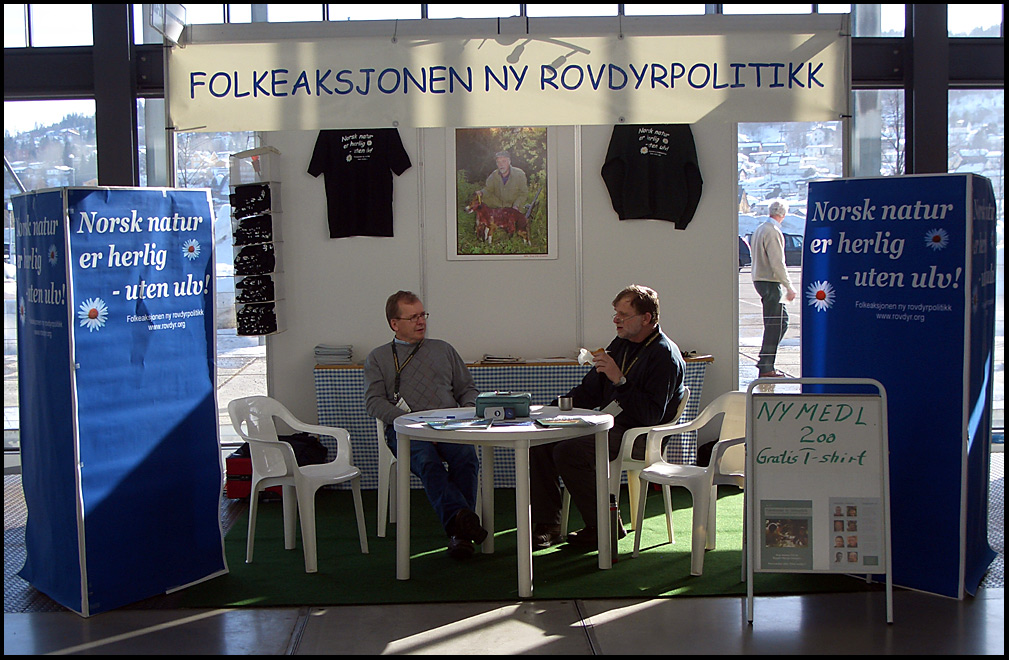 Arve Strømsæther og Knut Aaserud fra Akershus lokallag klar til innsats på Folkeaksjonens stand under på Villmarksmessen i Lillestrøm. Mange medlemmer var